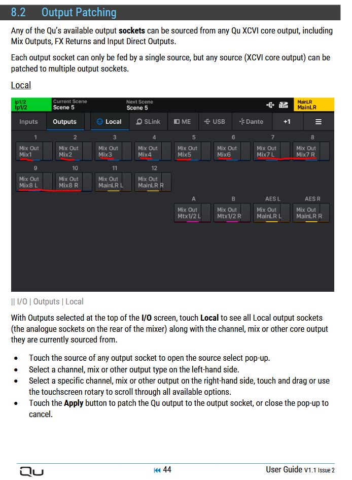 In the following image from the patching diagram (QU-5), I’ve underlined aux (mixes) 1 - 8 in red.