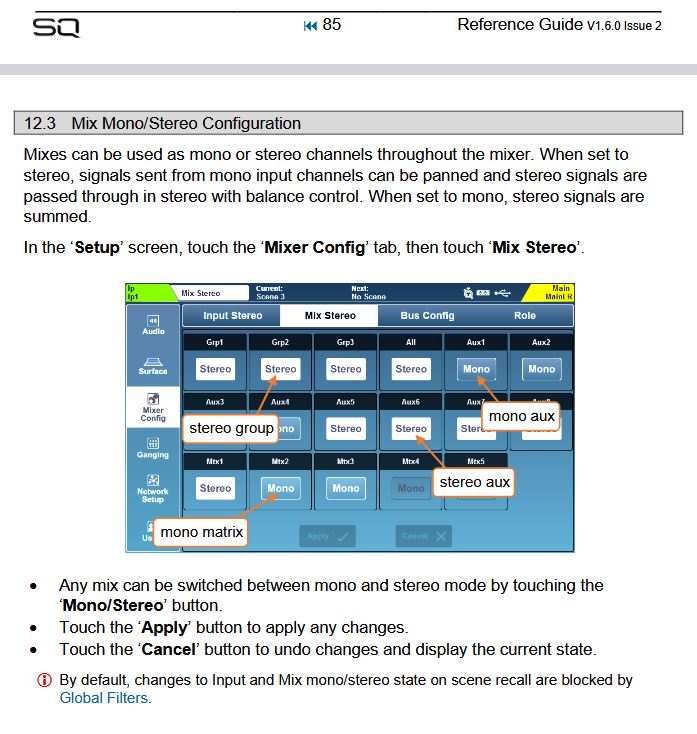 Besides Main LR, you have (up to) 12 stereo mixes available, which you can switch to mono as needed.